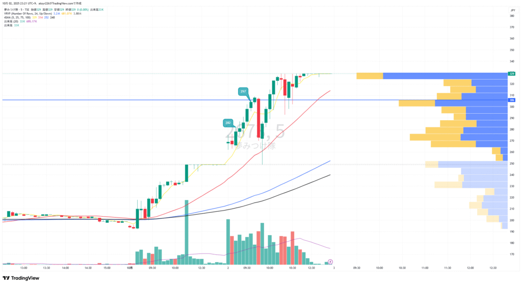 • 出来高の勢いを重視:300円直前で板が厚くても、出来高が伴って突破を狙う場面ではポジションを残す